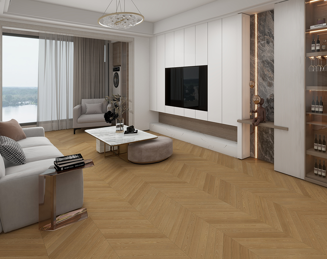 鱼骨拼使用平行四边形形状的单块模板进行拼铺,铺好后的地板线条看起来就像一根鱼骨一般。鱼骨拼地板铺贴好后空间感和立体感很强。横看它的线条宛如波浪一样,波光粼粼,翻涌不止;顺着线条方向看,有将狭窄的空间无限蔓延拓展的错觉。