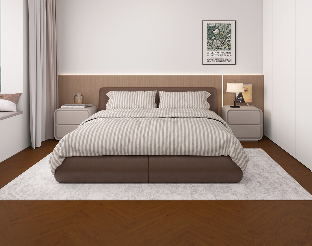 焦糖柚木以人字拼织出“焦糖印花毯”,柚木肌理在45°重叠中滴落恬淡咖光,视野被无限升级拓宽,大客厅秒变开扩大剧院;暖人色系与灰墙冷感,让家此外收获欧式高贵与冬日甜意。