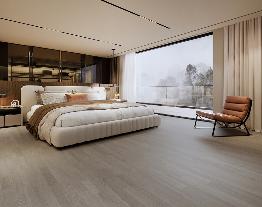 浅深灰色的三拼花白蜡木,正如同那风光,创造在浩瀚的乾坤、沐着春夏秋冬的风,丝丝线条温润如描绘,好像是把家也变得了那寓言般地游戏。