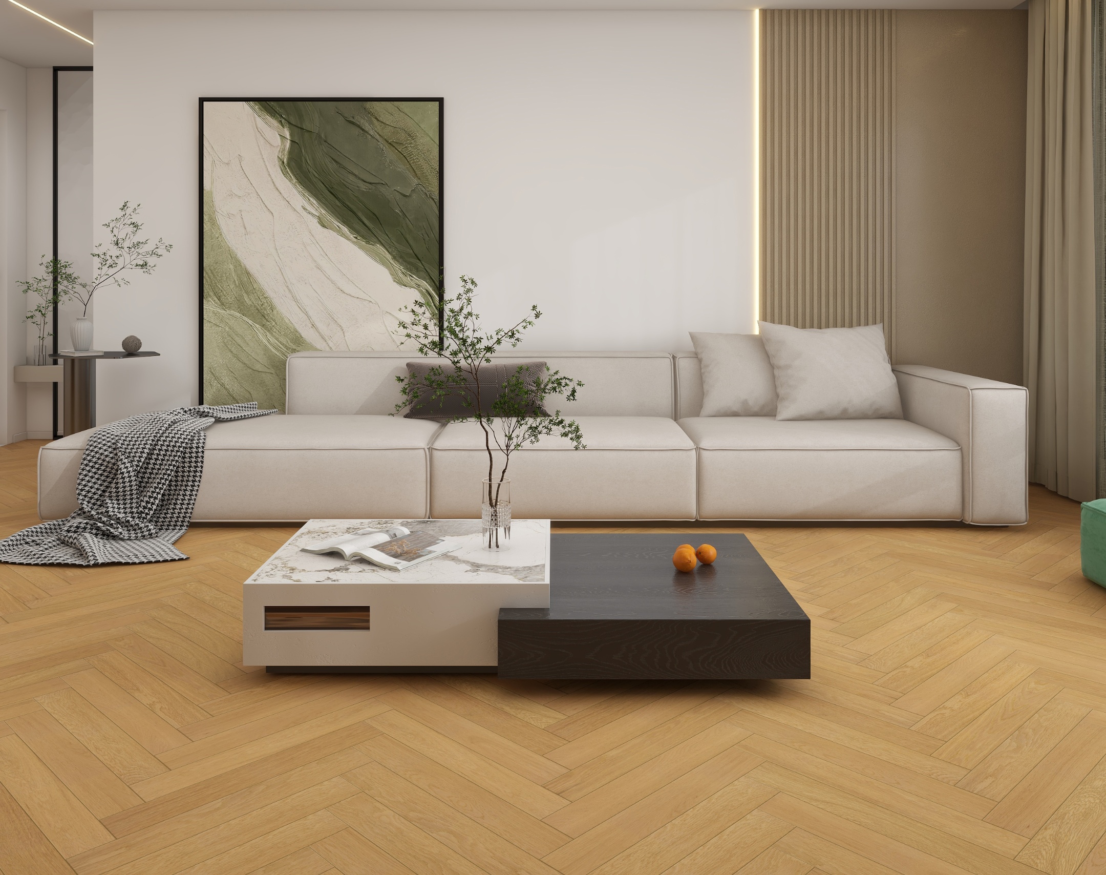 人字拼地板,因拼贴后形似“人"字形而得名。人字拼木地板,排列错落有致,大气又独具个性,能够给人带来强烈的视觉冲击力;将低奢与高贵的气质完美融合并加以演绎,给人复古而又时尚的美感。让家变得更惊艳,更有高级感