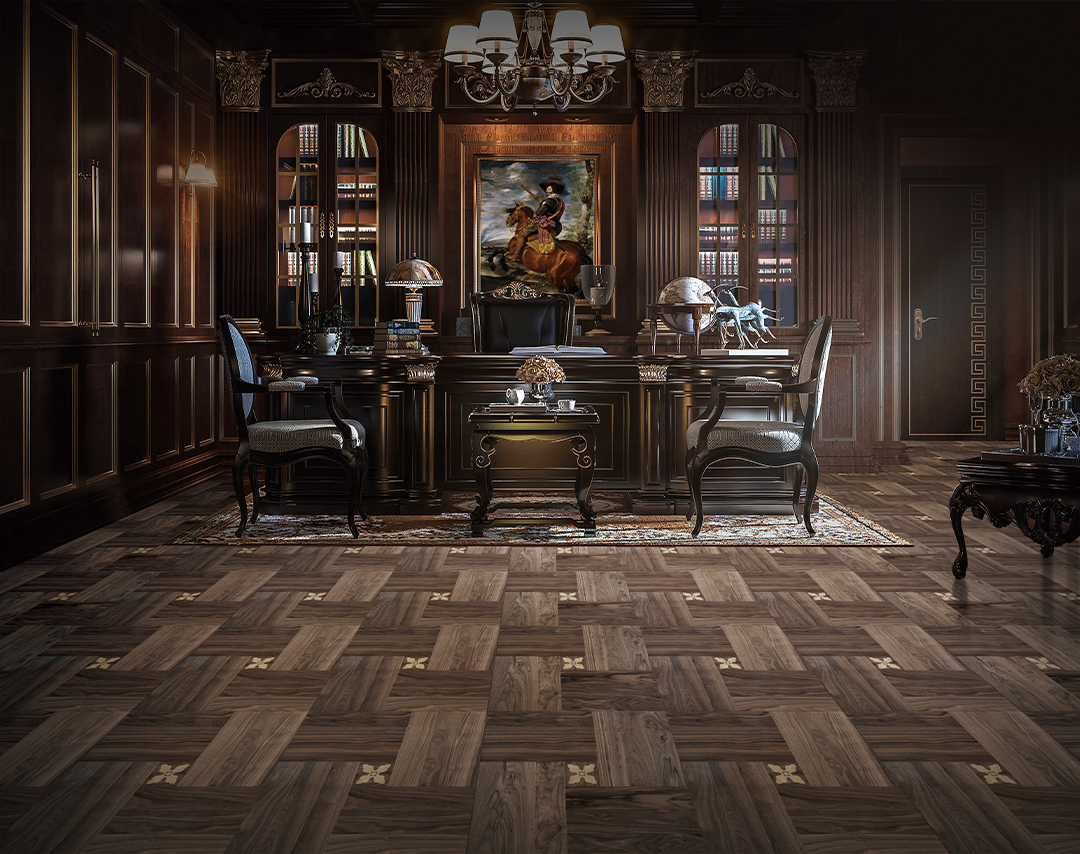 结构设计理念拼花结构设计,错落殷实审美感受,实木地板其本身的胡桃木系色调如同貴族城堡一样的貴族风格、大方致雅。